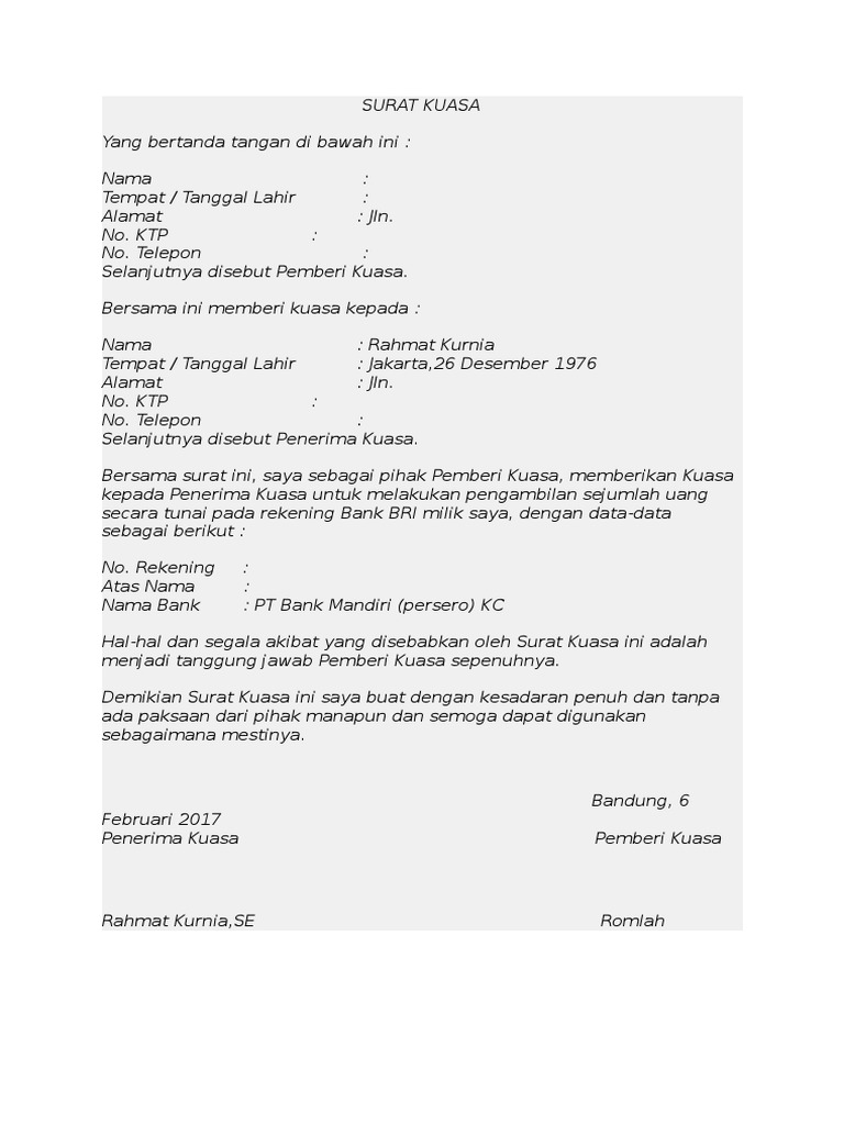 Lantas bagaimana cara membuat surat kuasa pengambilan uang di bank mandiri itu? Salah satu contohnya adalah membuat surat kuasa pengambilan uang di bank. Jadi, surat adalah alat komunikasi tertulis yang disampaikan dari. Contoh dari surat kuasa perseorangan merupakan surat kuasa pengambilan gaji pensiun surat kuasa pengambilan uang di bank surat kuasa walaupun ada banyak hal atau kegiatan bank yang bisa diwakilkan namun semuanya itu terbilang sama saja baik di bank bri di bank bni di bank. Berikut ini penjelasan singkat dan contoh lengkap surat kuasanya.