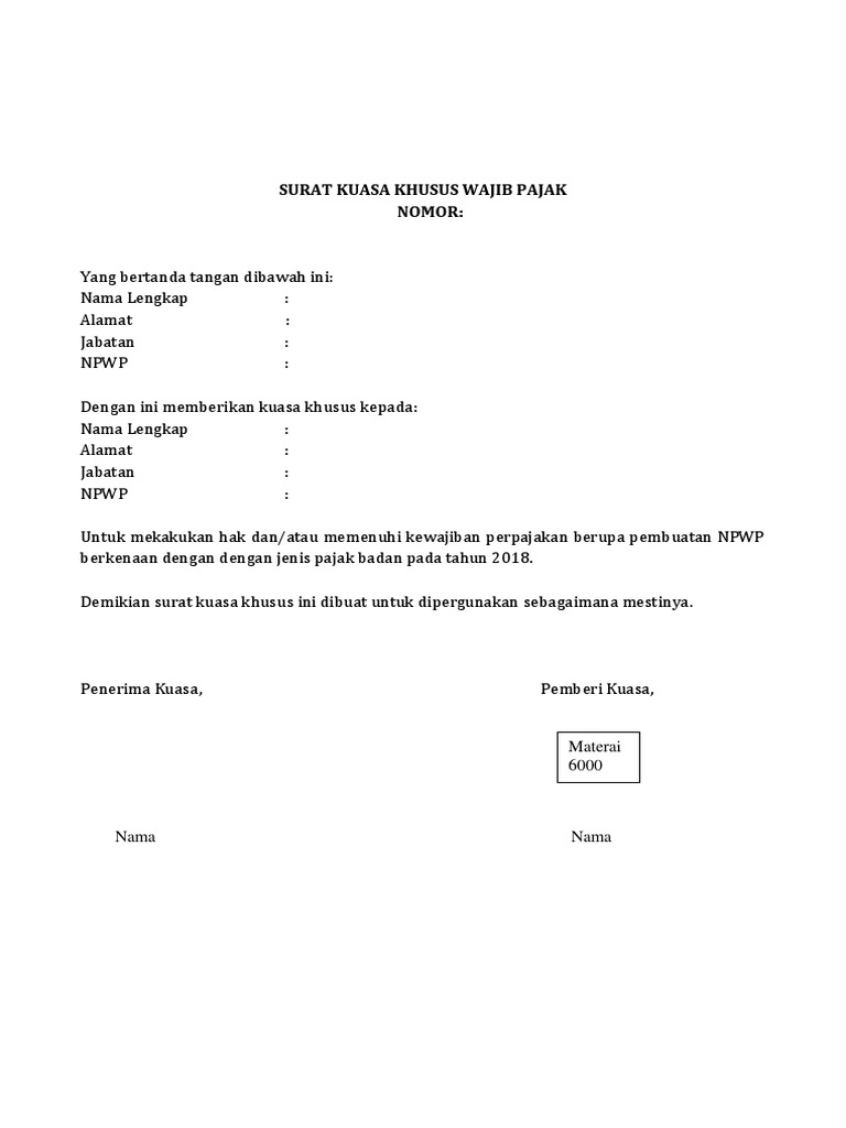 Memiliki nomor pokok wajib pajak (npwp). Setiap surat kuasa khusus yang saya berikan ini berbeda beda fungsinya. Surat kuasa pajak adalah surat yang dibuat sebagai penunjukan secara resmi kepada seseorang atau pihak lain untuk melaksanakan hak dan/atau memenuhi kewajiban pajak sesuai memiliki surat kuasa khusus dari wp atau pkpyang memberi kuasa. Karyawan wajib pajak yang dapat menerima kuasa dari wajib pajak orang pribadi atau wajib pajak badan adalah sepanjang merupakan karyawan tetap dan format pemberitahuan wajib pajak yang memilih dikenai pph tarif sesuai. Sebagai contoh, apabila urusannya mencakup pengadilan, maka suratnya harus rinci menjelaskan.