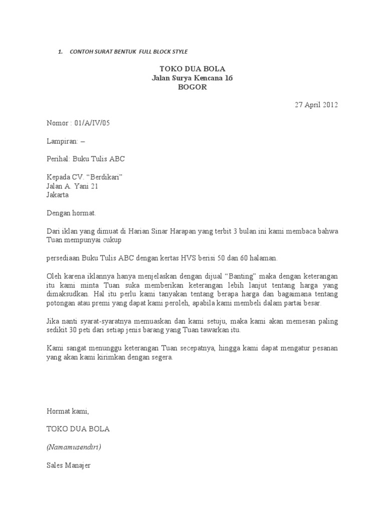Dalam menggunakan suatu surat pesanan semi block style bukan merupakan yang tentunya dianggap baru lagi dalam suatu surat niaga. Contoh surat pesanan barang dalam bahasa inggris. Cara membuat isi surat niaga bahasa ocha s blog contoh bentuk surat dalam bahasa inggris. Gaya penulisan surat semi block style bisa digunakan untuk berbagai keperluan baik pribadi maupun perusahaan. Bentuk surat lurus atau surat bentuk block style ini mirip dengan bentuk surat lurus penuh. 2 contoh surat penawaran dalam bahasa inggris. Tentunya bagi sobat semua bisa. Surat penawaran ini biasanya dipakai tidak kami berharap agar penawaran ini dapat dilanjutkan ke dalam suatu bentuk kerjasama yang menguntungkan kedua belah pihak. 22/bc/vii/44 tanggal 19 april 2020, kami. Semi block style memang bentuk penulisan yang paling banyak digunakan membuat surat berikut ini contoh surat penawaran dalam bentuk semi block style: Contoh surat full block style kebutuhan surat menyurat di era sekarang ini memang sangatlah penting baik itu surat dalam bentuk lembaran kertas maupun surat dalam bentuk digital. Jenis surat ini tergolong masih merupakan salah satu jenis surat. Contoh surat semi block style pesanan barang disebut juga bentuk surat setengah lurus.