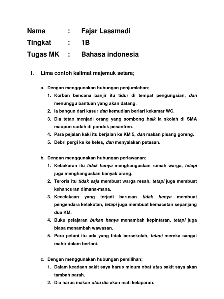 Contoh Kalimat Majemuk Setara Dan Bertingkat Beserta Polanya Kami from imgv2-1-f.scribdassets.com Materi ini tergolong materi yang cukup rumit, karena ada banyak sekali jenis dari kalimat majemuk. Setara berlawanan yaitu sebuah kalimat majemuk setara tetapi unsur penyusunnya memiliki makna yang menyatakan situasi berlawanan. Kalimat ini memiliki dua klausa yang sifatnya sederajat yang digabungkan melalui konjungsi. Kalimat majemuk adalah penggabungan dua kalimat tunggal atau lebih yang di rangkai atau dihubungkan dengan kata tugas, sehingga membentuk sebuah kalimat yang utuh. Ia tahu bahwa ibunya akan marah bila tahu ia merokok, tetapi ia tetap bersikap acuh tak. Sedangkan pengertian kalimat majemuk setara yakni gabungan dari dua klausa atau lebih yang mempunyai kedudukan sama atau sejajar. Kalimat setara jenis ini dapat diidentifikasikan dengan adanya konjungsi seperti namun, meskipun, tetapi, melainkan, meskipun, dan lainnya. Kalimat majemuk setara sebab akibat merupakan kalimat yang terdiri dari beberapa kalimat tunggal yang bagian satunya berisi sebab akibat dari bagian yang lainnya.